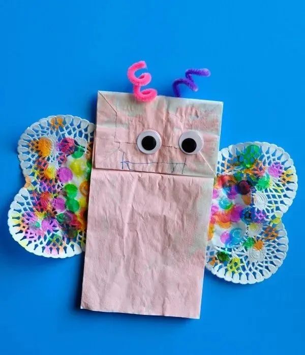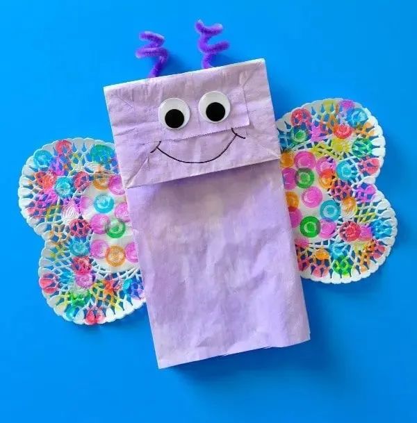 最后用扭扭棒捏出蝴蝶触角穿过纸袋就好啦