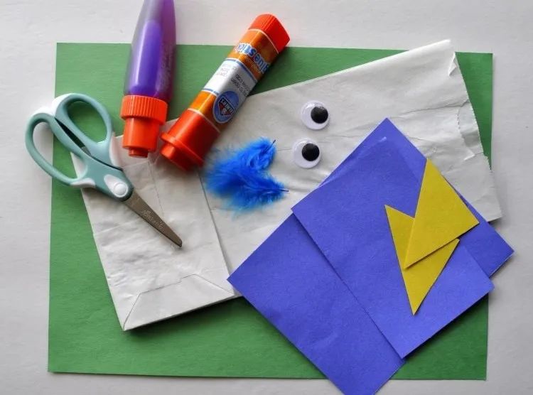 准备材料:外卖纸袋、彩纸、活动眼球、剪刀、羽毛、固体胶等