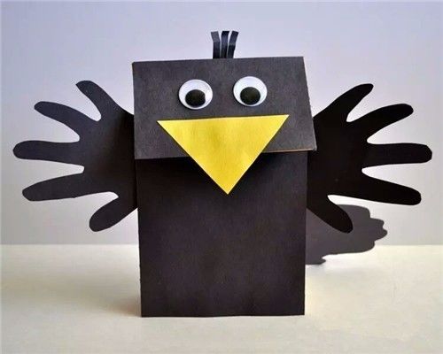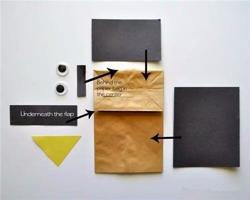 材料:纸袋、黑色硬卡纸、剪刀、手工眼睛等