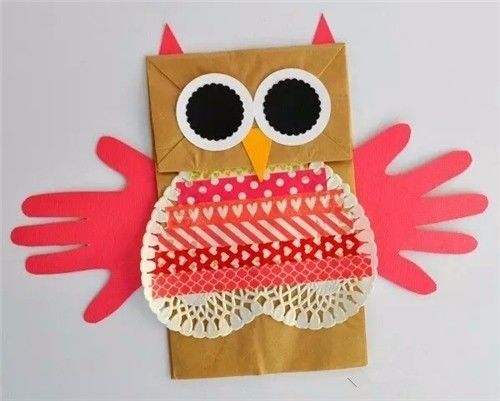 材料:纸袋、剪刀、手工眼睛、彩色卡纸、双面胶、亮晶晶贴片、羽毛