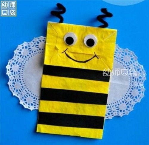 2.贴上触角、手工眼睛和花边翅膀,小蜜蜂就做好啦!