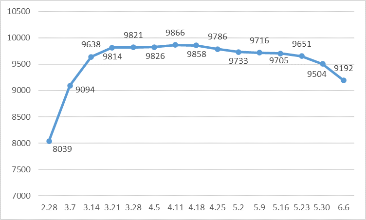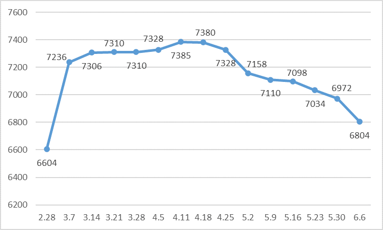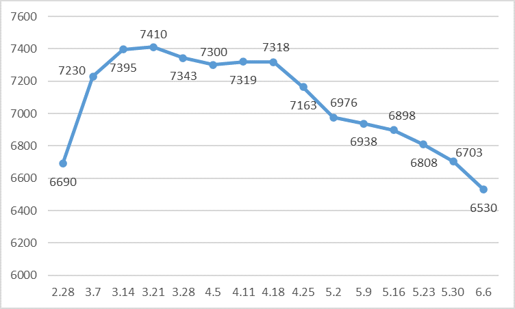 白卡纸每周含税市场均价走势(单位:元/吨)铜版纸市场均价的走势与白卡纸基本一致。只不过,其拉涨的时间更短,由截止2月28日一周的6604元/吨,大涨9.57%升至截止3月7日一周的7236元/吨。随后,便进入缓慢上涨阶段,逐步升至截止4月11日一周的阶段性高点7385元/吨。随后8周时间,铜版纸市场均价连续下跌,且跌幅有所放大,截止6月6日一周降至6804元/吨,比高点下跌7.87%。