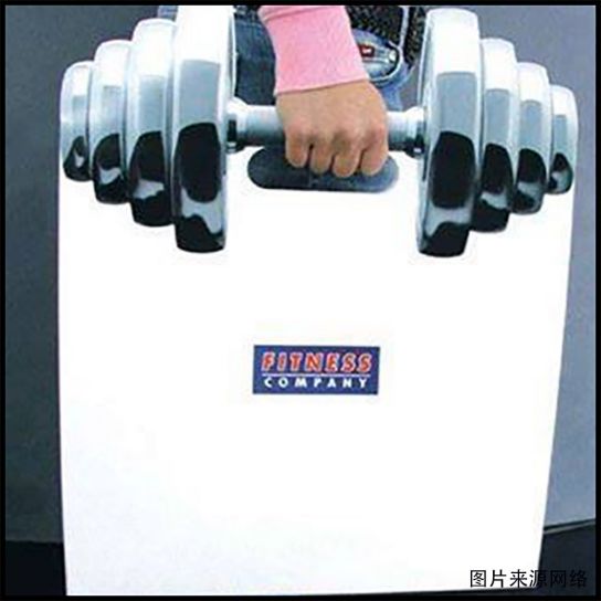 一家健身房的手提袋,做成了哑铃的样子,从远处看就像举了个哑铃一样,谁一看都知道这袋子的品牌和健身相关。
